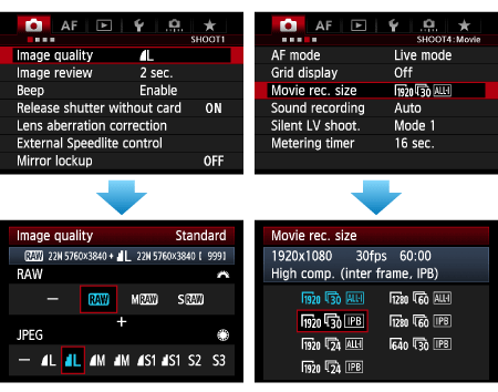] tab, press the <SET> button, and then select the image quality from the screen that appears.