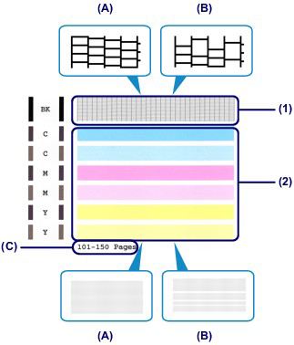 - The total number of sheets printed so far is shown in increments of 50 sheets on the printout of the nozzle check pattern.