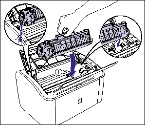 6. Align the projections on both sides of the toner cartridge with the toner cartridge guide inside the printer, push the toner cartridge completely into the printer (1), and then pull it down toward you (2).