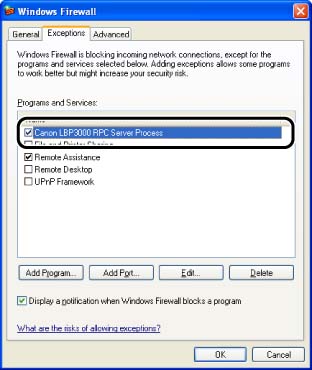 To confirm that the Windows Firewall block has been properly cleared, select [Control Panel] from the [Start] menu, then click [Network and Internet Connections] -> [Windows Firewall]. Make sure that the [Canon LBP3000 RPC Server Process] check box is selected in the [Exceptions] sheet in the [Windows Firewall] dialog box.