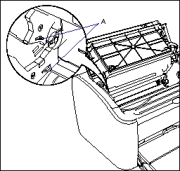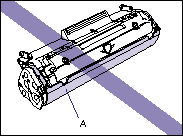 b. Print quality may deteriorate if you touch or damage the drum inside the drum cartridge. Be sure not to touch or open the drum protective shutter (A). Be careful not to hold or touch sensitive areas that are not specified in this procedure. This may result in damage to the cartridge.