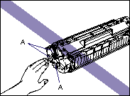 c. Be careful not to hold or touch sensitive areas such as the electrical contacts (A) or sensor, as this may result in damage to the toner cartridge or printer.