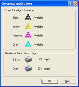 The [Consumables/Counters] dialog box in the Printer Status Window can be used to estimate when toner cartridges will need to be replaced. The status of each of the color toner cartridges is displayed in the [Consumables/Counters] dialog box. For details on the procedure for displaying [Consumables/Counters], see "How to display [Consumables/Counters]" below.