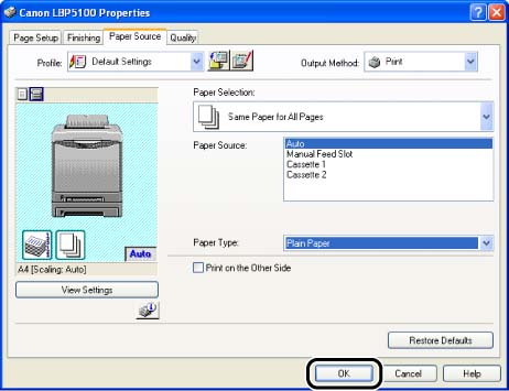d. When printing heavy paper, transparencies, or labels from the paper cassette, select [Cassette 1] or [Cassette 2] in [Paper Source]. When [Auto] is selected, paper cannot be fed from the paper cassette.