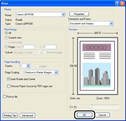 b. For more details on the settings for the printer driver, see Online Help. For details on methods for displaying Online Help, see "Chapter 5 Printing a Document" in User's Guide (PDF manual) in the CD-ROM supplied with the printer.