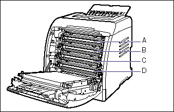 c. The toner cartridges are installed in order of black (A), yellow (B), cyan (C), and magenta (D) from the top as shown in the figure.