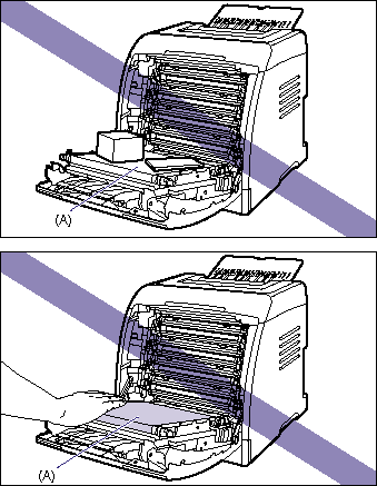 e. Do not place any object on or touch the transfer belt (A) of the ETB unit. The transfer belt of the ETB unit is supplied with a function that cleans itself, therefore, do not clean the belt even when the toner is on it. If the ETB unit is broken or transfer belt is damaged, this may result in misfeeds or deterioration in print quality.