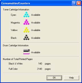 | Cartridge(s) may need to be replaced soon. For details, check the [Consumables/Counters] dialog. | When a toner cartridge or the drum cartridge needs to be replaced soon. | a. You can continue to print. b. Check which cartridge(s) need to be replaced in the [Consumables/Counters] dialog box. If a toner cartridge needs to be replaced soon, have ready a new toner cartridge. c. It is recommended that you replace the toner cartridge before printing a large amount of data. |
