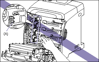 f. Do not place any object on or touch the transfer belt (A) of the ETB unit. The transfer belt of the ETB unit is supplied with a function that cleans itself, therefore, do not clean the belt even when the toner is on it. If the ETB unit is broken or transfer belt is damaged, this may result in misfeeds or deterioration in print quality.