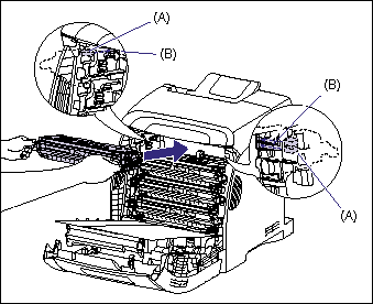 Align (A) of the toner cartridge that you want to replace with the slots (B) to which the label of the same color is attached, then insert the cartridge until it stops.