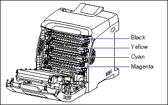 d. The toner cartridges are installed in order of black, yellow, cyan, and magenta from the top as shown in the figure.