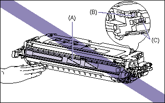 d. Print quality may deteriorate if you touch or damage the photosensitive drum inside the toner cartridge. Be sure not to touch or open the drum protective shutter (A). Do not jolt the toner cartridge memory (B) or bring it near a magnetic field. Be careful not to hold or touch areas that are not specified in this procedure, such as the sensor (C). This may result in damage to the cartridge.