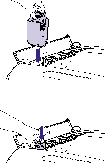 6. While holding the tab, insert the toner cartridge into the printer (1), and then push it gently until it stops (2) as shown in the figures.