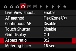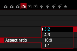 The image’s aspect ratio can be set to [3:2], [4:3], [16:9], or [1:1]. The area surrounding the Live View image is masked in black when the following aspect ratios are set: [4:3] [16:9] [1:1].