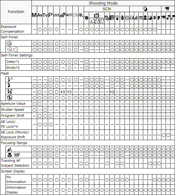 If you cannot set certain shooting functions, please check the current shooting mode of your camera. Some shooting functions may not be available in certain shooting modes. For details on the possible combinations of shooting functions and shooting modes, please refer to the following list.