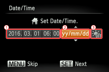 Set the current date and time correctly as follows if the [Date/Time] screen is displayed when you turn the camera on. Information you specify this way is recorded in image properties when you shoot, and it is used when you manage images by shooting date or print images showing the date. You can also add a date stamp to shots, if you wish.