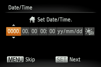 - Unless you set the date, time, and home time zone, the [Date/Time] screen will be displayed each time you turn the camera on. Specify the correct information.