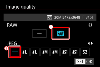 ] buttons and choose [ JPEG], and then choose the image size and quality.Note that only RAW images are captured when [–] is selected.