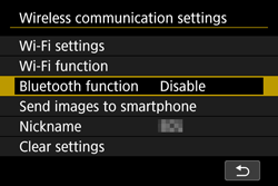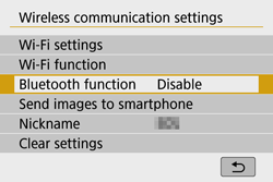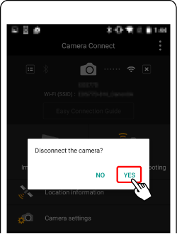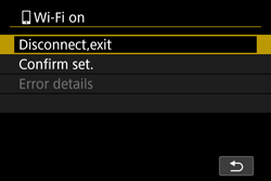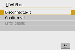 Wi-Fi on] screen, select [Disconnect, exit]. - Terminating the Wi-Fi connection will switch the camera to the Bluetooth connection.
