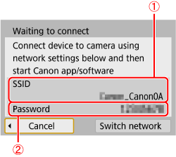 ) displayed on the camera’s LCD monitor. - In [Wi-Fi settings], if you set [Password] to [None], the password will not be displayed or required.