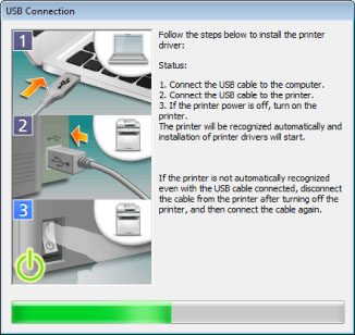 2. When the following screen appears, connect the computer and the printer with a USB cable, and turn ON the printer.