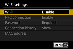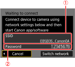 ) displayed on the camera’s LCD monitor. - In [Wi-Fi settings], if you set [Password] to [None], the password will not be displayed or required.