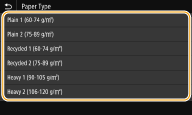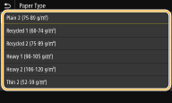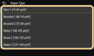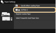 - After the default paper setting is registered, the paper setting screen is not displayed when paper is loaded, and the same setting is always used. If you load a different paper size or type without changing the paper settings, the machine may not print properly. To avoid this problem, select <Specify When Loading Paper> in step 3, and then load the paper.