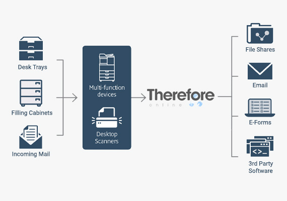 Therefore™ Online可擷取資料,將其轉換成數位格式,並從中製定索引以便於搜尋。如其他流行的搜索引擎般,Therefore™ Online支援全文搜尋或在文件內搜索所需的資料,亦能在處理複雜的掃描需求時,與其他後端系統整