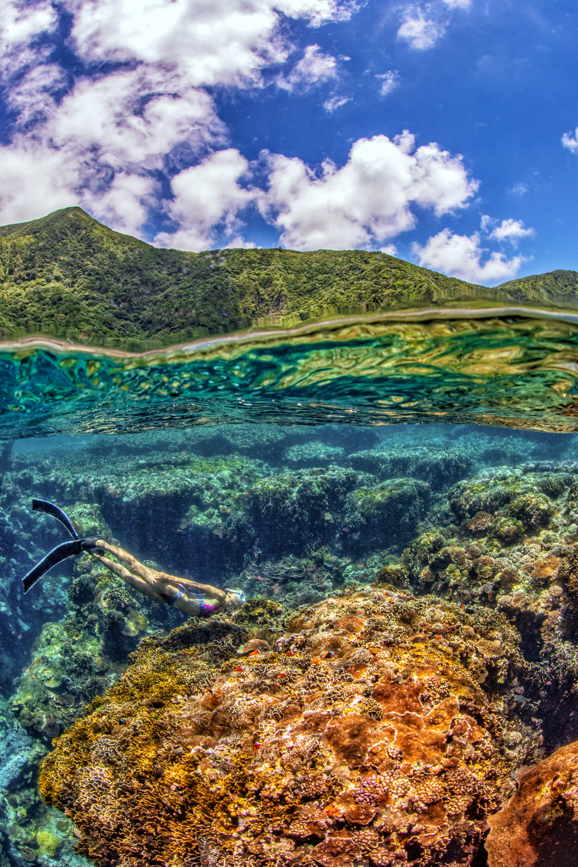 水下看哈巴狗與睡美人。火山島特殊的玄武岩地貌延伸到海平面下,讓人能在水下欣賞這獨特的風景。