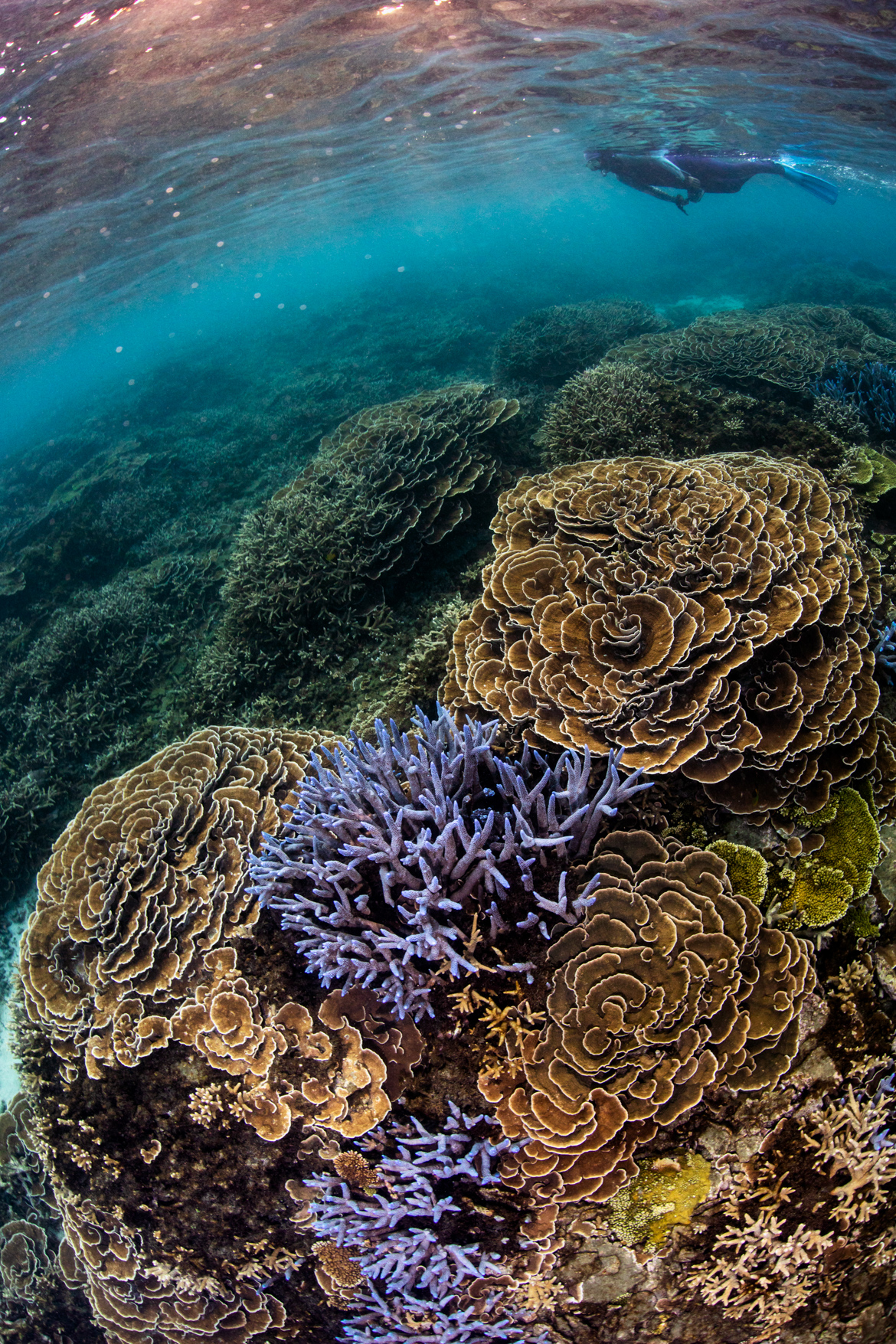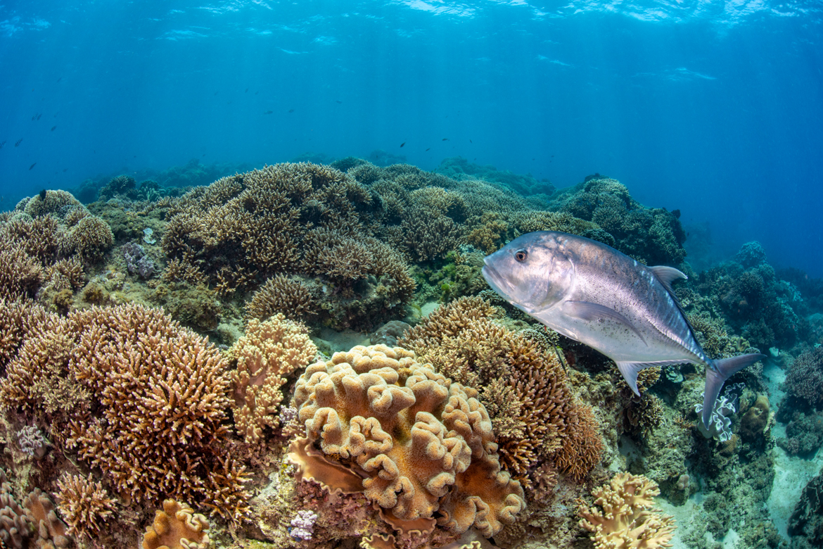 俗稱大牛的牛港鰺在一大片鹿角珊瑚中優游,好似在逛花園。