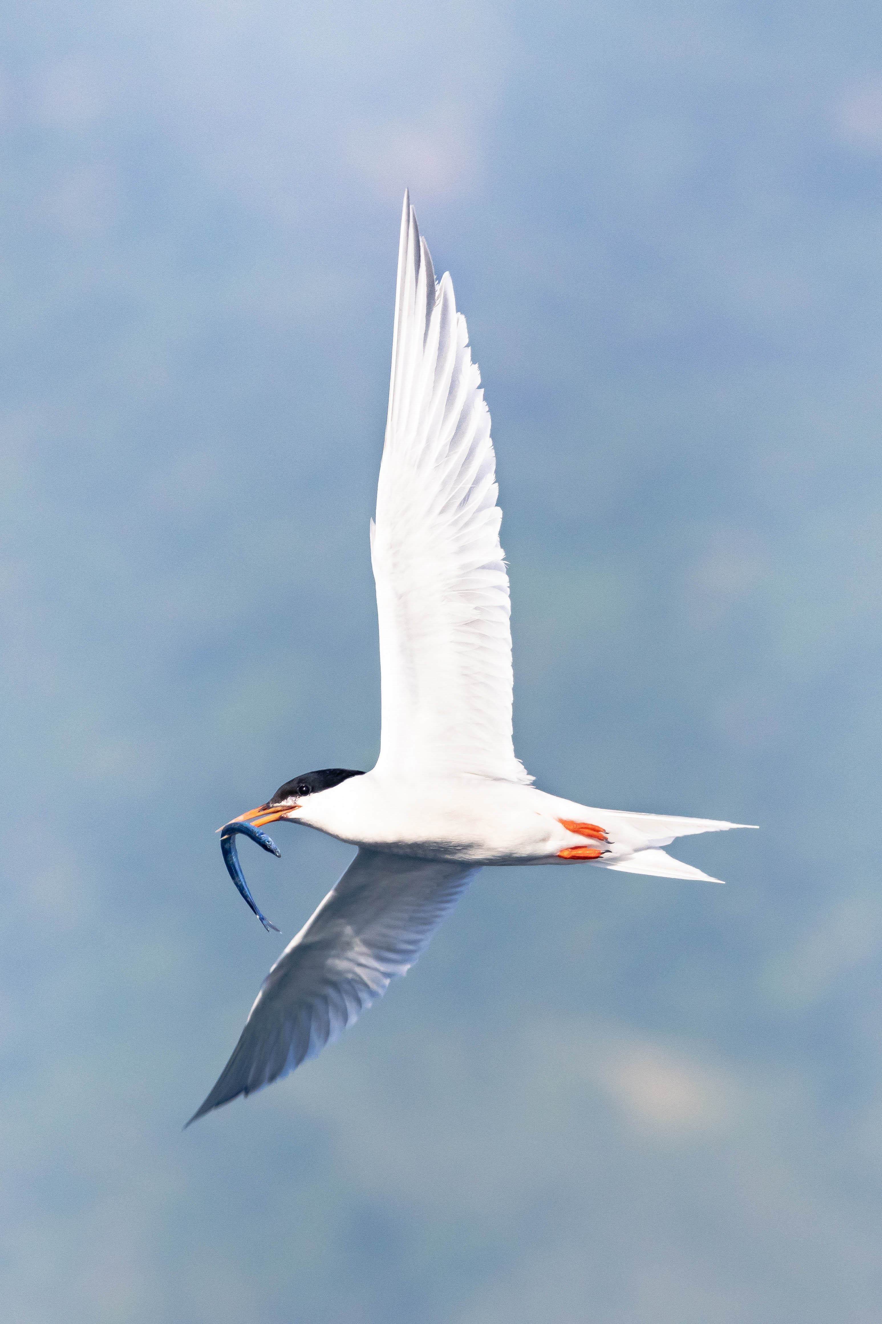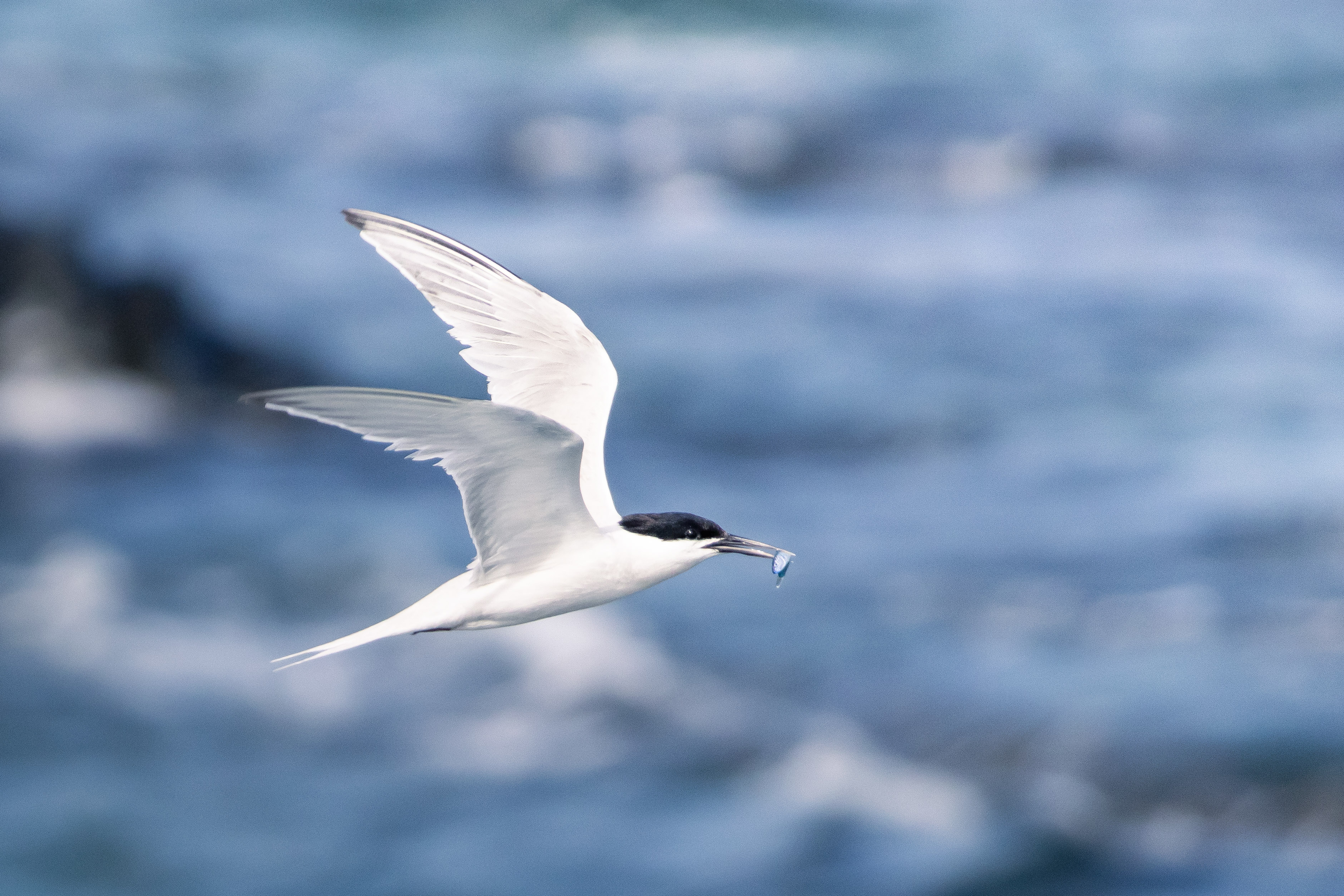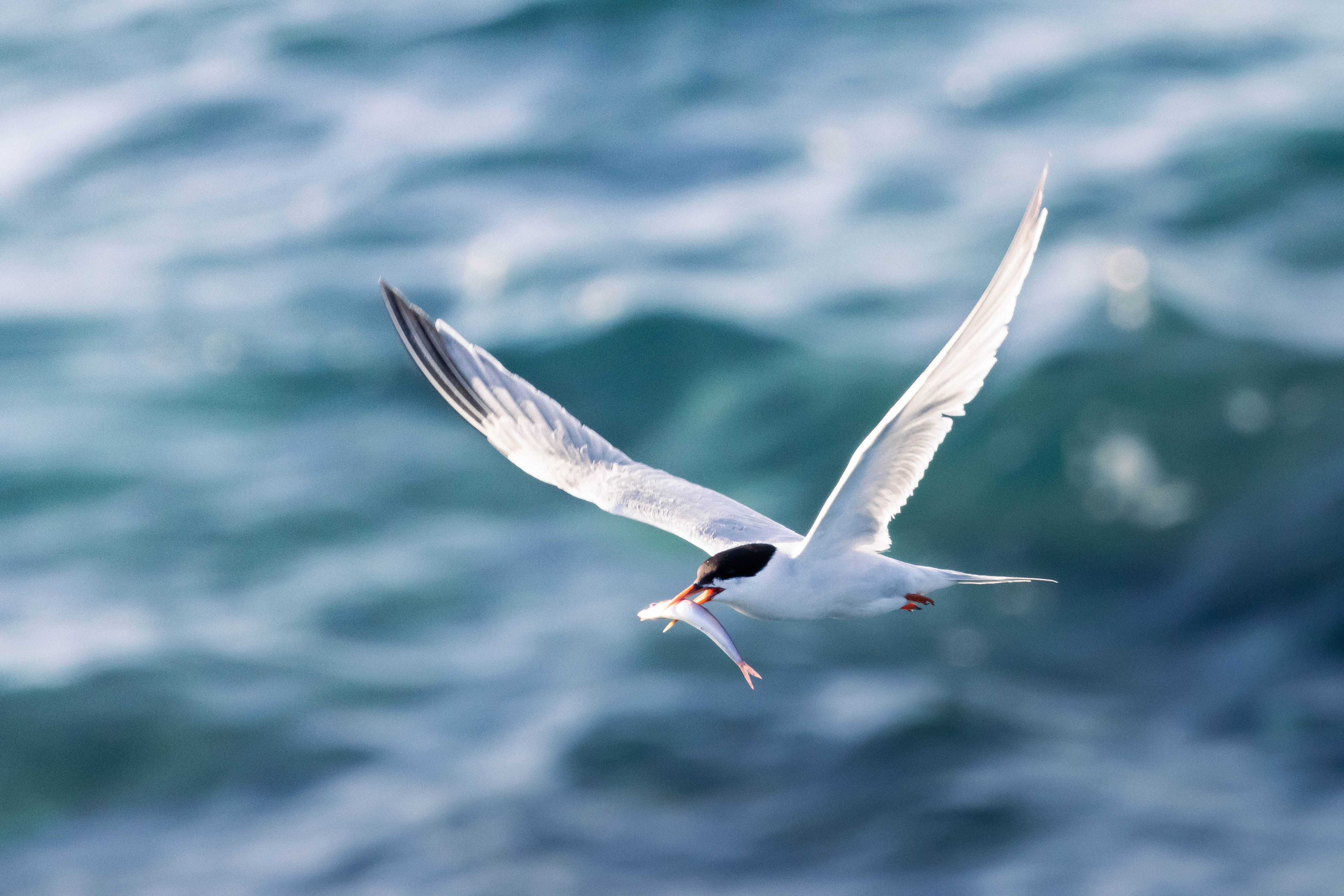 無暇的羽色在藍空下飛舞,矯捷的身手下墜海面,一個瞬間小魚到口。燕鷗們是最優雅的海上獵人。