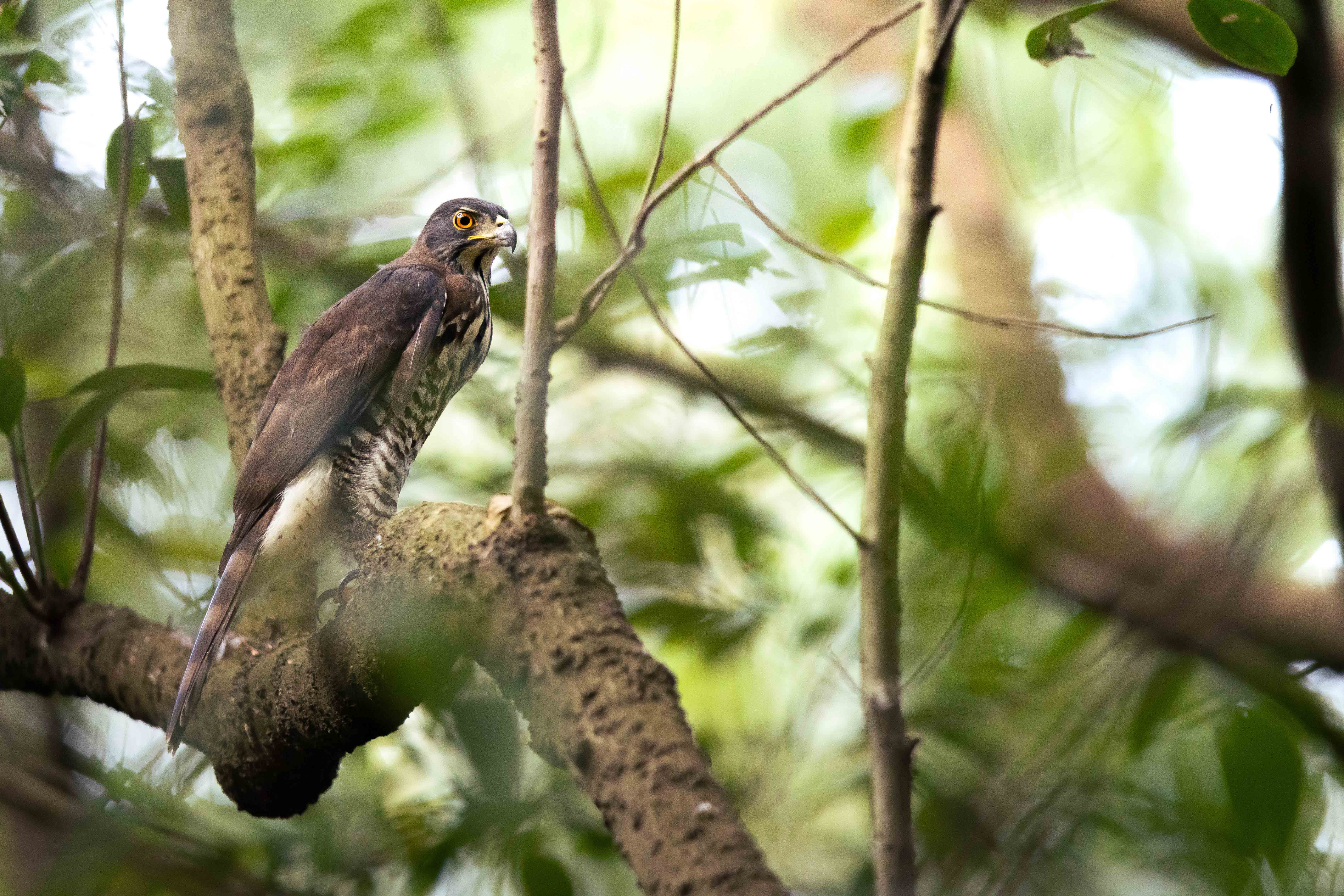 走在低海拔的森林,四周頓時悄然無聲,直覺告訴我掠食者的來到,緩緩蹲低身子,從灌木中探頭尋找。霎時間,那銳利的眼神映入眼簾,靜靜棲於樹林之間,四處張望探尋獵物。屏息按了幾次快門,半晌,那羽翼無聲無息,隨著綠意遁入山林。