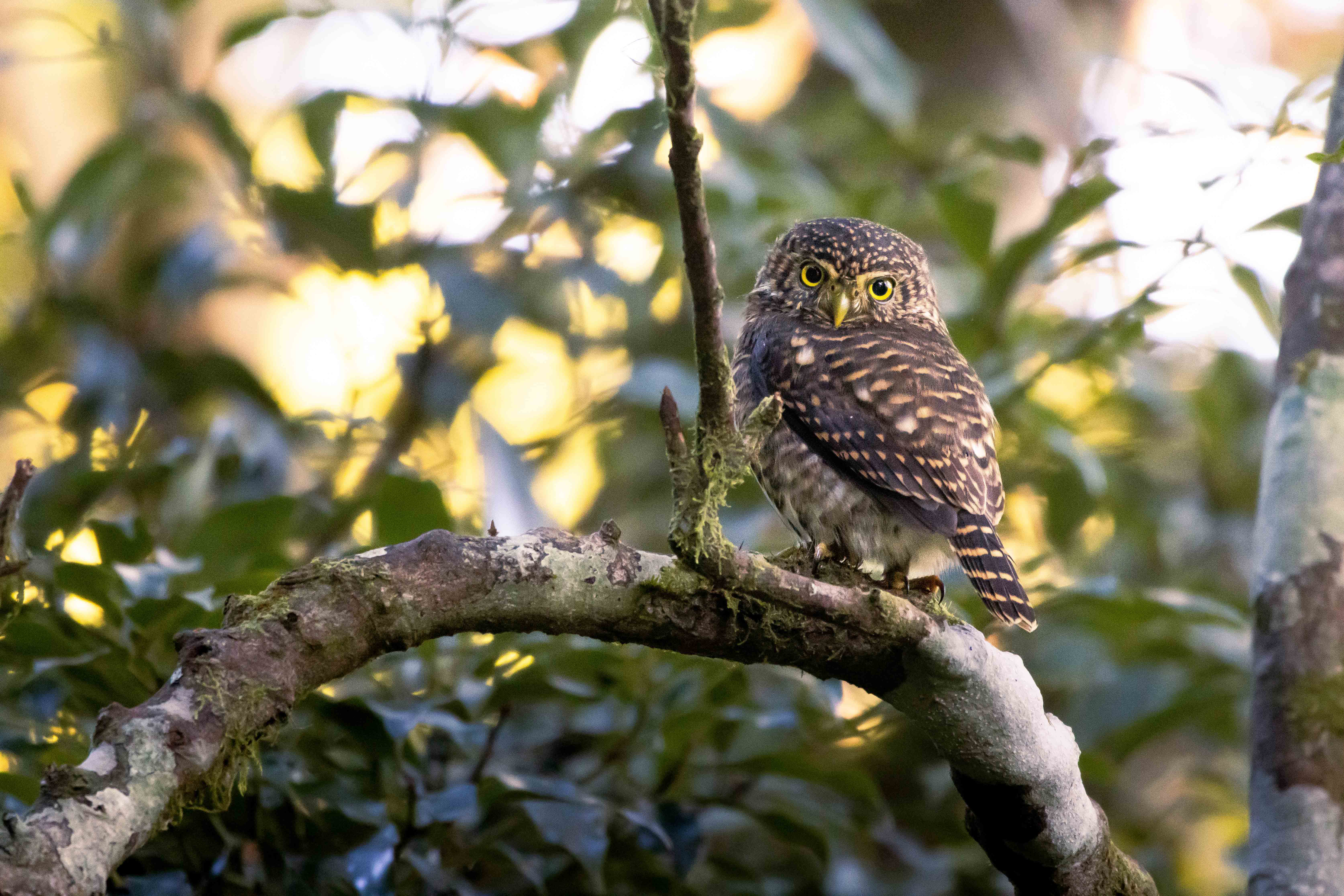 我的心臟此刻開始奏鳴,呼吸不自覺間早已屏息,多次聽見鳥鳴卻從未瞥見的身姿,此時正與我互相對視。在圖鑑上的外表明明如此可人,身心卻被那眼神緊緊擒住,像獵物被鎖定般震懾在地。出乎意料的巧遇令我呆愣原地,我知道我正被那美深深吸引,逐漸臣服那銳利眼光,那是期遇已久的,臺灣最小的貓頭鷹。