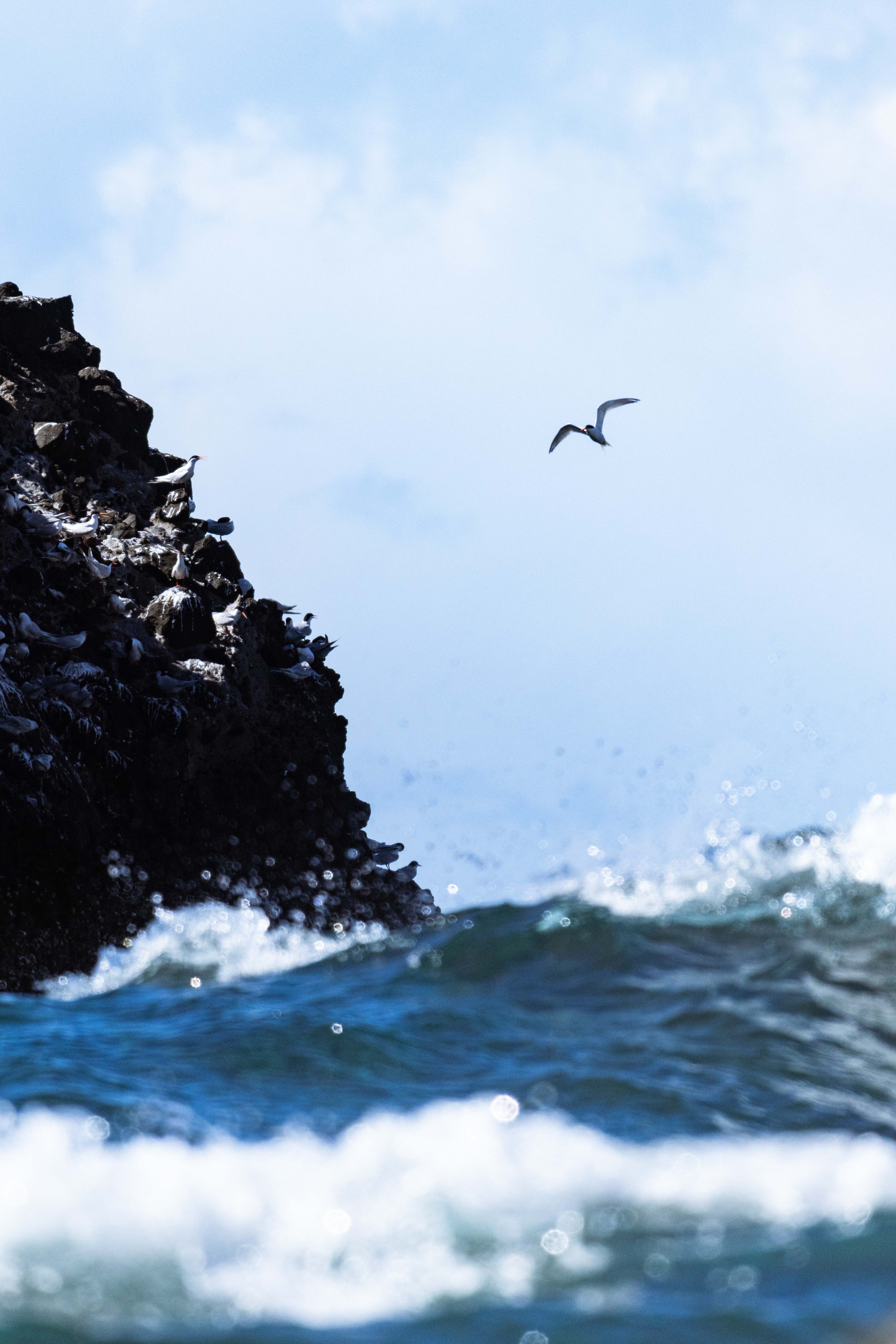 早晨八時,太陽早已升起,燕鷗們結群成伴橫跨海岬,準備出海捉魚飽足一頓。