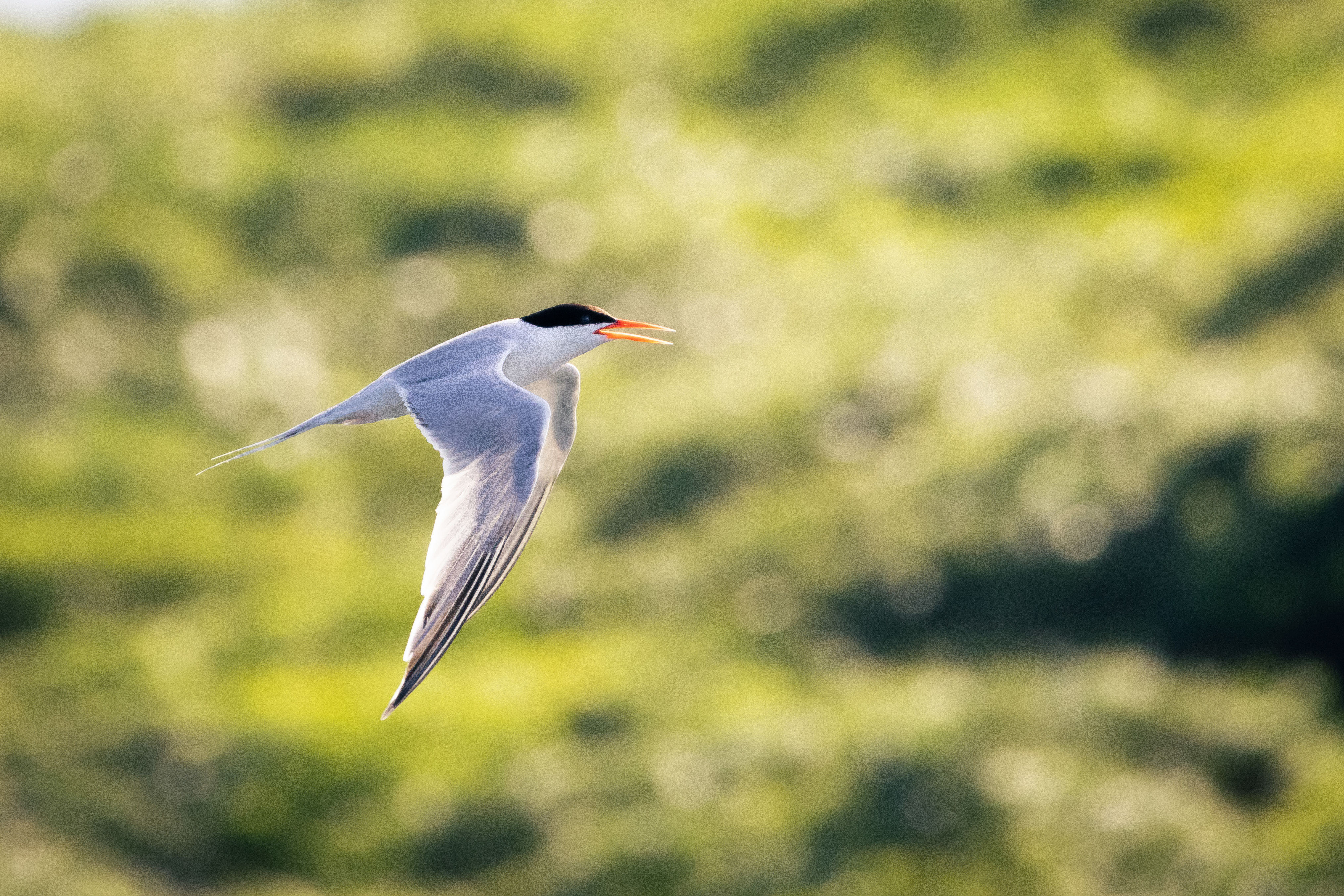 燕鷗在清晨的艷陽下飛舞,掠過島嶼清脆的綠,翱翔於海岸平靜的藍。