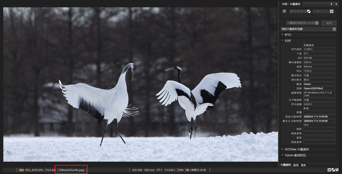 就是鏡頭不夠長或拍攝主體太小。雖然從 EOS R5 開始便有1.6X 的裁切模式,可以將主體裁切放大,但這樣相片的尺寸會嚴重縮小至原本的 3/1 左右 ( 4500 萬畫素->1700 萬畫素 ),若還需要局部裁切,尺寸便會重不足。EOS R5 Mark II 內建了「相機內放大」功能,可以在拍攝後在相機內直接將影像擴增至驚人的 1 億 7800 萬像素,並藉由深度學習科技,放大後的影像可以產生更多細節。這樣一來,不論是局部裁切、重點格放做二次構圖,裁切後的相片仍能維持相當大的尺寸,且畫質清晰。不論是輸出或商業用,解析度都仍相足夠。