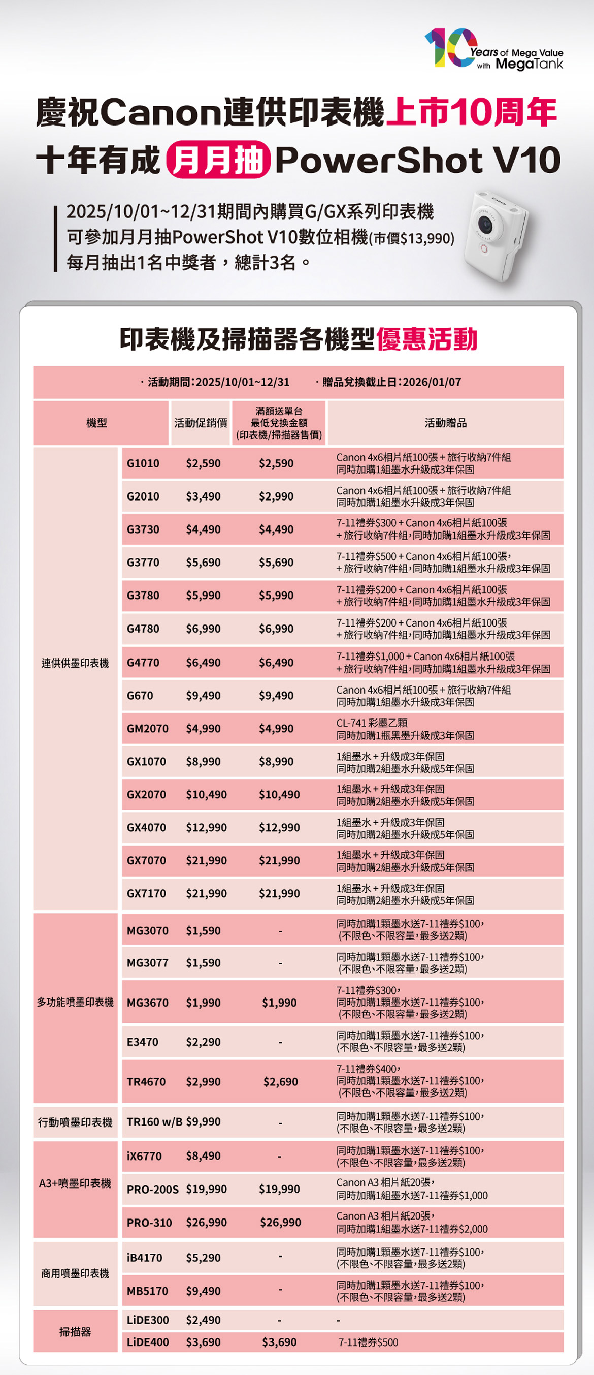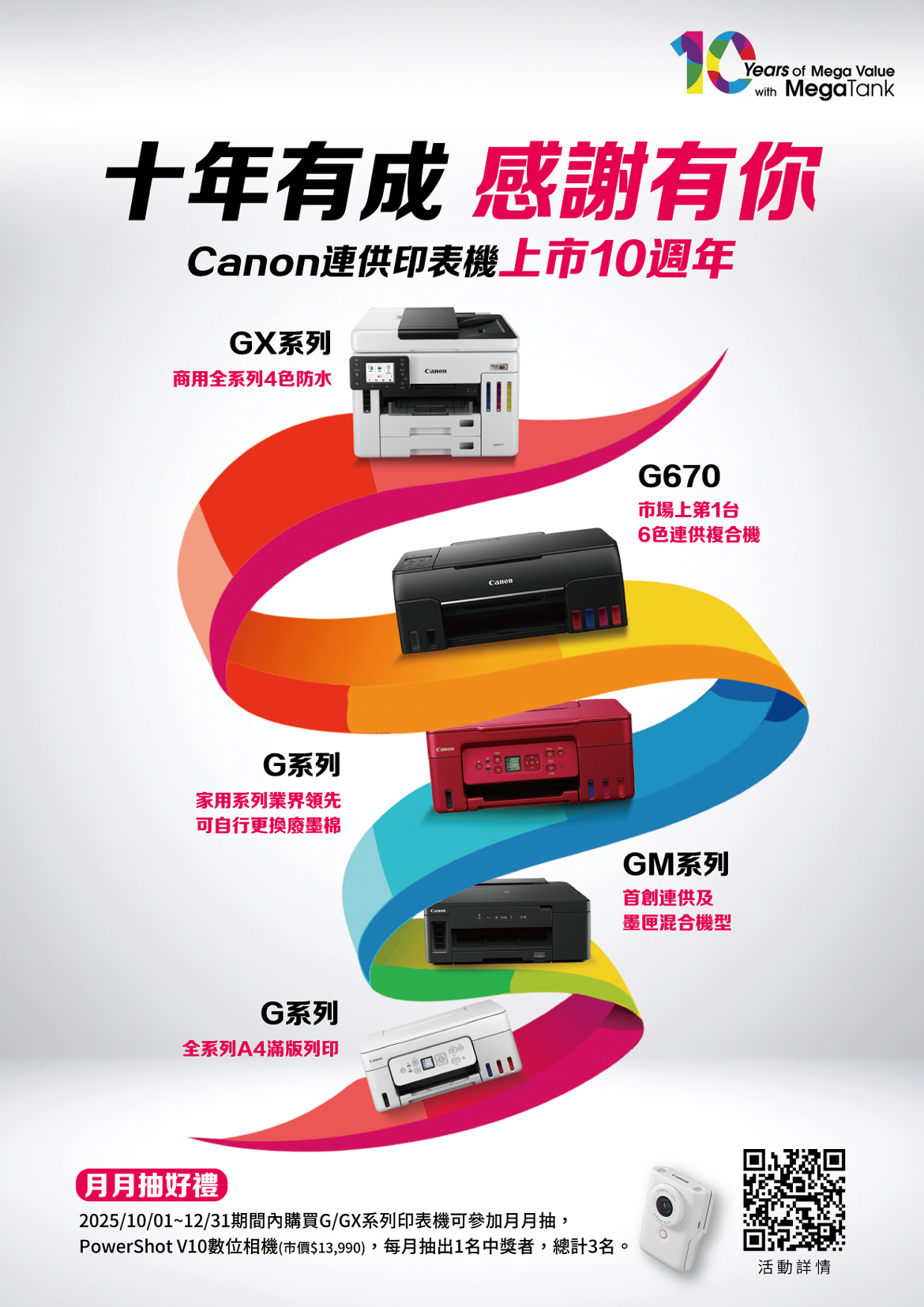 歡慶 Canon 連供印表機上市十週年,感謝一路相伴!活動期間凡購買 Canon 連供系列印表機(含 G 系列、GM 系列與 GX 系列),完成登錄即可參加「月月抽 Canon PowerShot V10 影音相機(市價$13,990)」活動,把創作靈感帶著走。