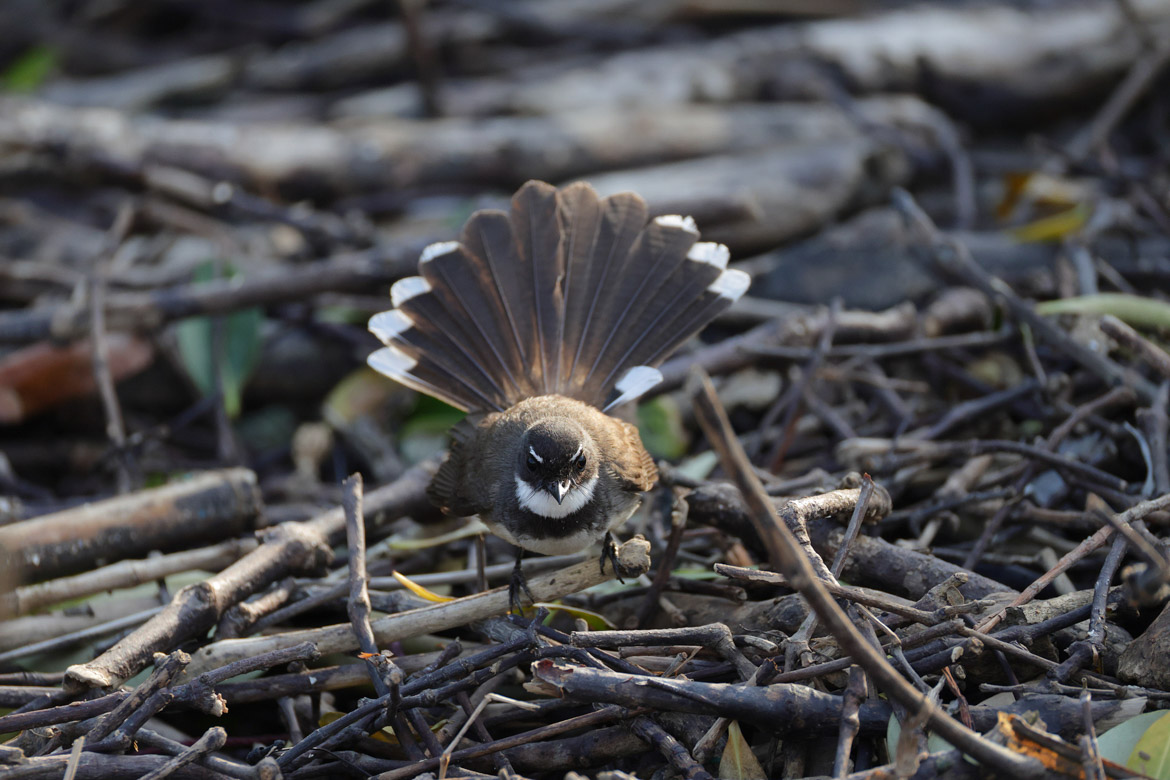 斑扇尾鶲有著漂亮的長尾羽,經常在地面跳動隨時擺尾,有了預連拍只要看到動作的瞬間按下快門,成功率幾乎是100%