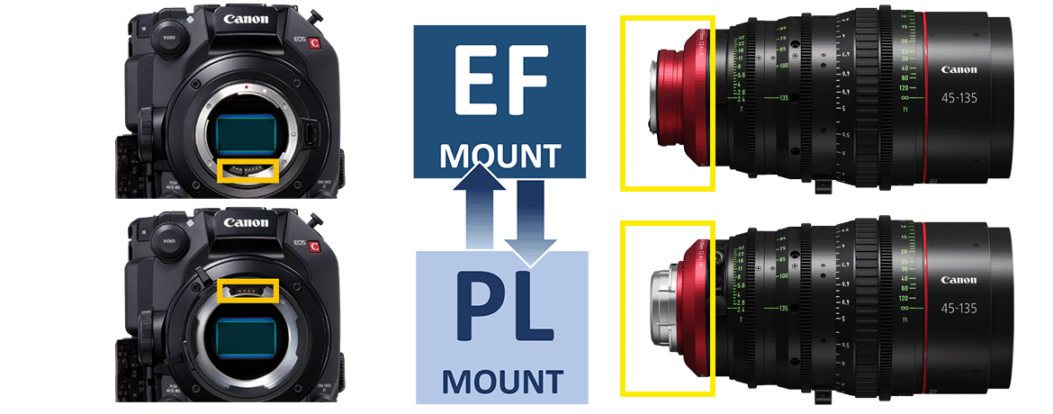 本鏡頭的接環可更換為 EF 接環或 PL 接環,讓您可依攝影機系統彈性選擇搭配使用。此外,可更換式接環設計也確保了此鏡頭的長期投資價值與使用彈性。
