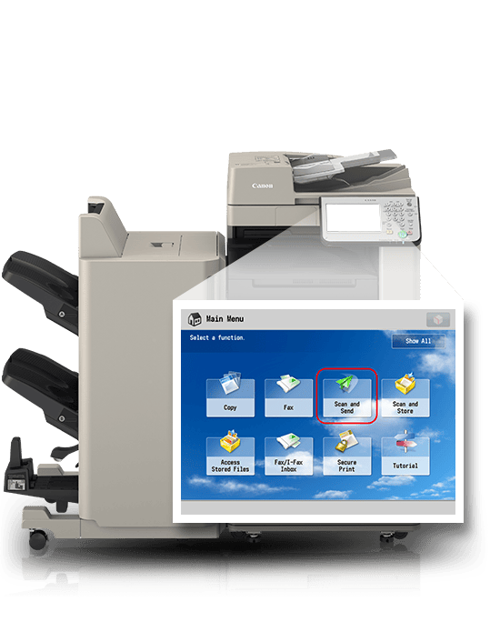 - 請將原稿擺放在玻璃平台或自動送稿器,按下Canon裝置上[主選單]內的[掃描並傳送]。