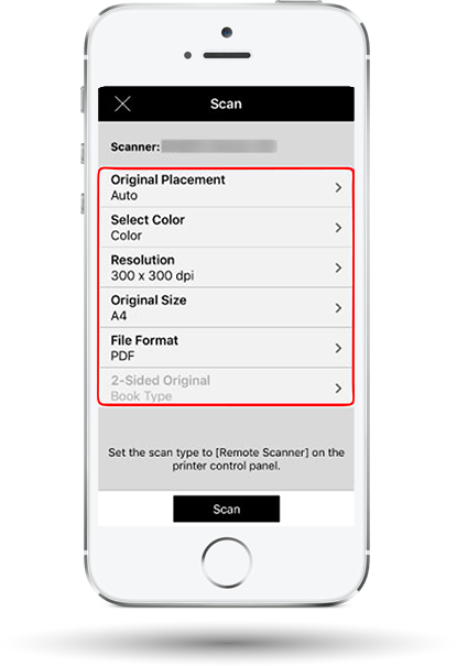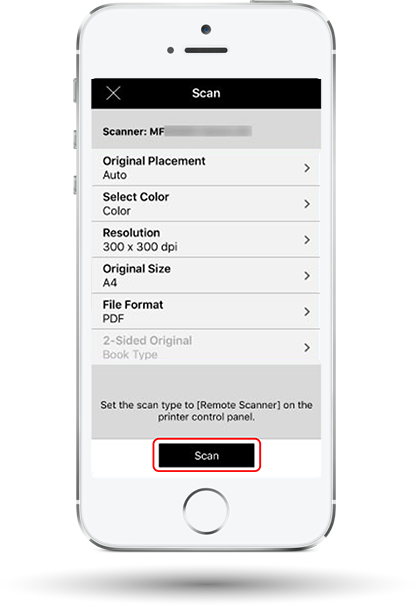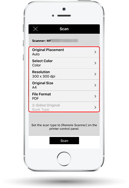 針對imageCLASS,必須先在Canon裝置上配置好掃描設定值,接著再將行動終端裝置設定成該配置內容。
