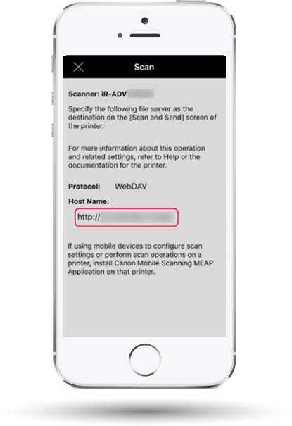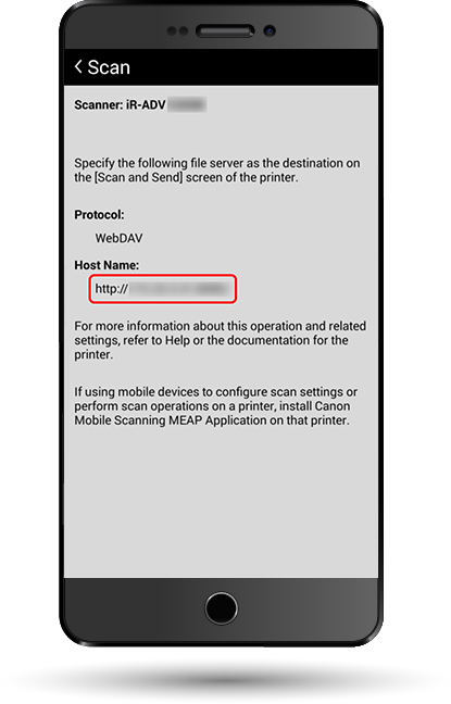 - 請在[協定]欄位選擇[WebDAV],並輸入顯示於應用程式[掃描]畫面內顯示的[主機名稱]。
