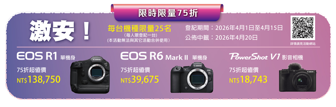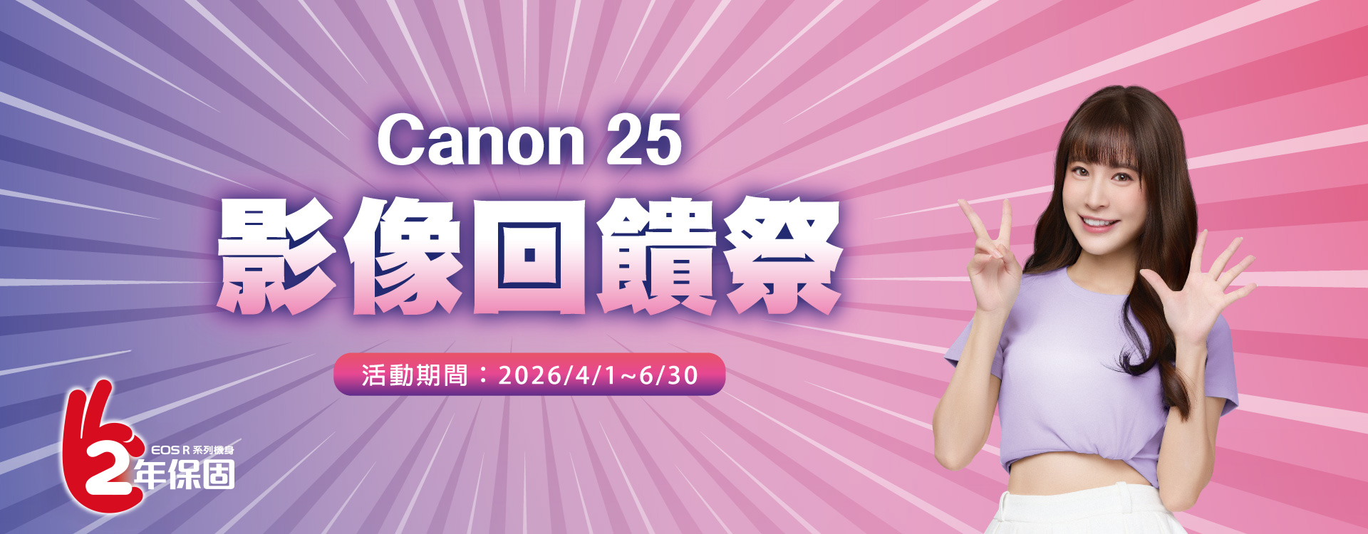 - 於活動期間內參加「Canon 25 影像回饋祭」活動,每台相機機號及鏡頭機號僅限兌換乙次,僅限保固註冊本人親自申請,不得由他人代為申請。