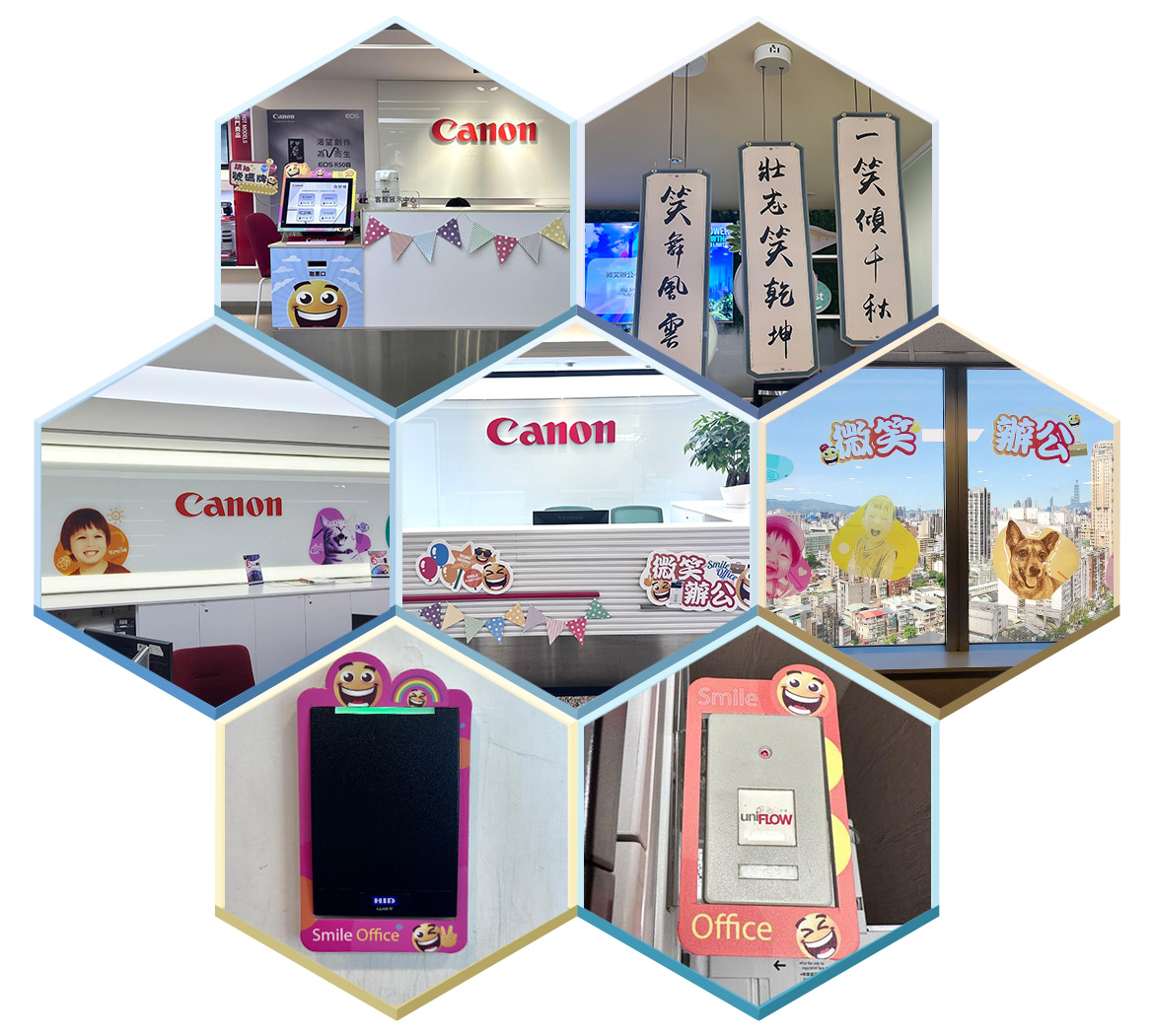 Smile Office 希望為大家帶來歡樂的工作環境,不論是大廳接待櫃檯、事務機刷卡處、打卡機、客服中心、咖啡休憩區,在公司的各個角落都可以看到 Big Smile 的佈置物,讓辦公室裡處處都有笑容。
