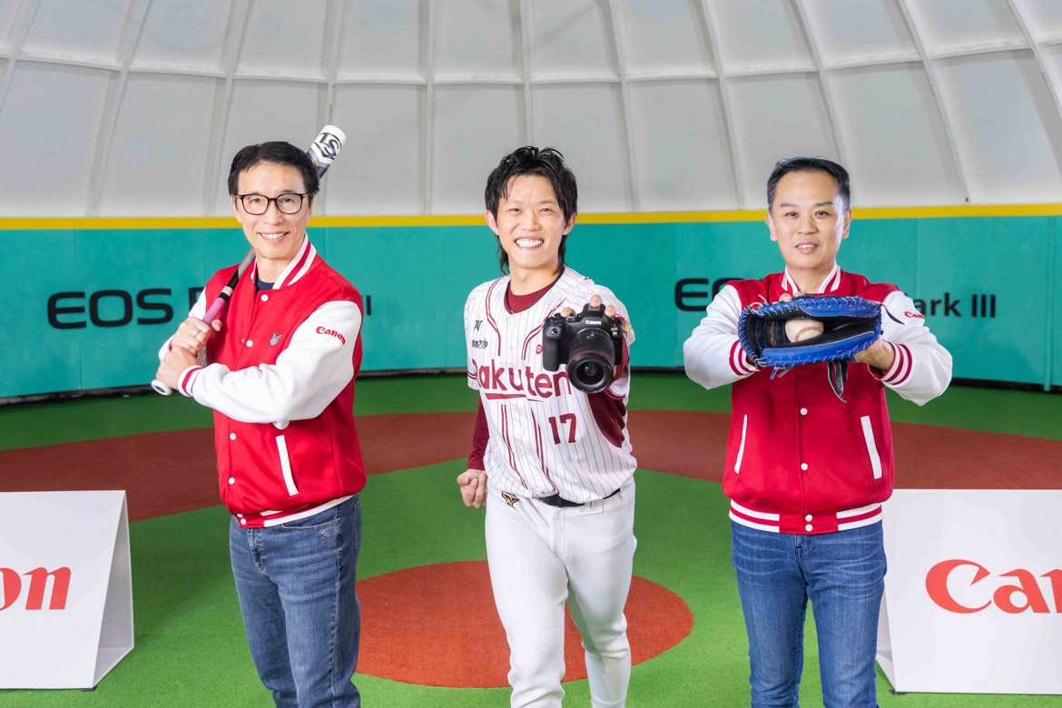 ( 圖左:台灣佳能資訊 總裁 胡大剛,圖中:12 強冠軍投手陳冠宇 圖右:台灣佳能資訊 市場行銷企劃資深經理 曾銘智 )