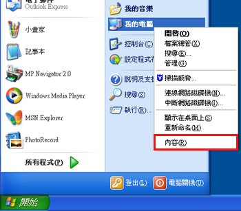 2-1. 右鍵按一下「我的電腦」,然後按一下「內容」。