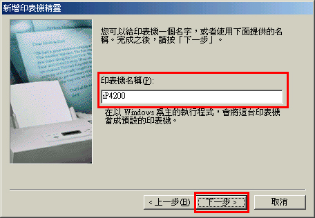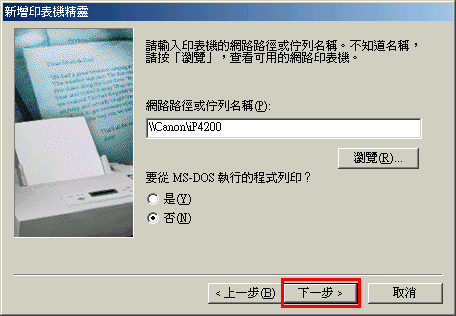 3-7. 顯示「新增印表機精靈」視窗時,請確認在「網路路徑或佇列名稱」中輸入了網路路徑(此處,以 \\Canon\iP4200 為例),然後按一下[下一步]。