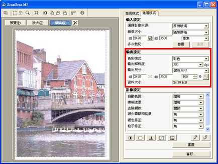 在「MP Navigator」的[掃描設定]中的[掃描解析度]下或在「ScanGear MP」的[進階模式]中的[輸出解析度]下指定解析度。