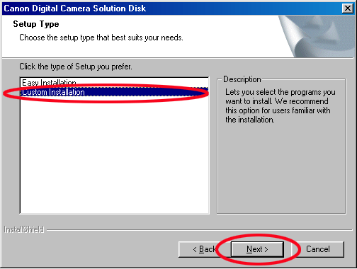 5. 在[安裝類型(Setup Type)]對話方塊,選擇[自訂安裝(Custom Installation)],按一下[下一步(Next)]。