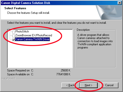 8. 在[選擇功能(Select Features)]對話方塊中只按一下[佳能相機 TWAIN 驅動程式(Canon Camera TWAIN Driver)]核選方塊,然後按一下[下一步(Next)]。